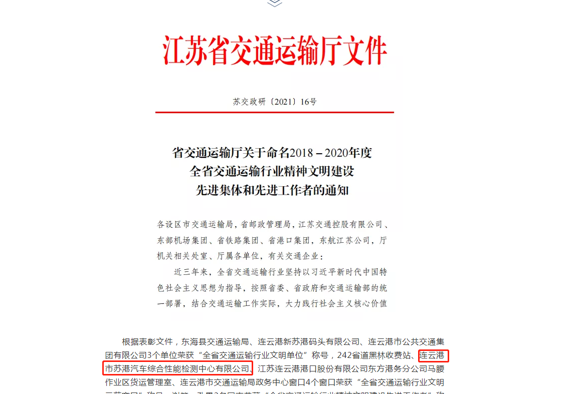 近日,江蘇省交通運(yùn)輸廳發(fā)布了關(guān)于命名2018-2020年度全省交通運(yùn)輸行業(yè)精神文明建設(shè)先進(jìn)集體和先進(jìn)工作者的通知文件,汽服公司汽車(chē)檢測(cè)事業(yè)部榮獲“全省交通運(yùn)輸行業(yè)文明示范窗口”稱(chēng)號(hào)。