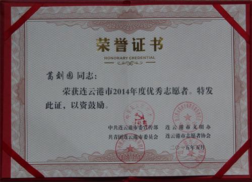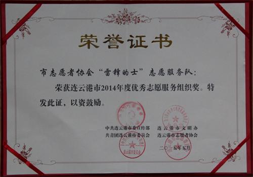 5月14日,借連云港市志愿者協(xié)會第三次會員代表大會召開之際,連云港市委宣傳部、市文明辦、團市委、市志愿者協(xié)會對2014年度優(yōu)秀志愿者、優(yōu)秀志愿服務(wù)組織進行表彰,連汽出租公司“雷鋒的士”車隊榮獲“2014年度優(yōu)秀志愿服務(wù)組織”榮譽稱號,葛劉園榮獲“2014年度優(yōu)秀志愿者”榮譽稱號。